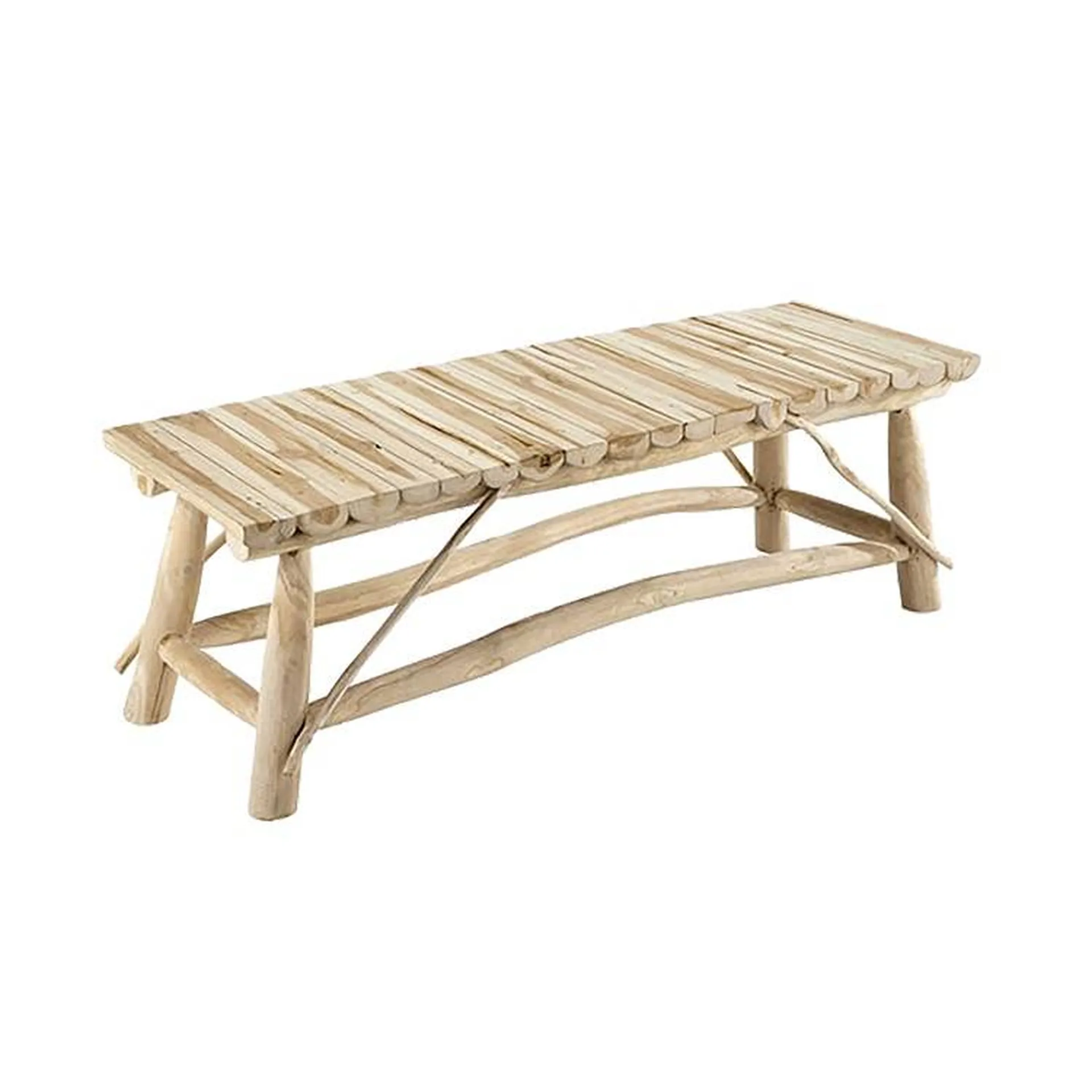 Le banc Havane est un joli banc dont la structure et l'assise sont en teck massif. Le piétement est constitué d'un assemblage de branches et le plateau de l'assise de demi-bûches.