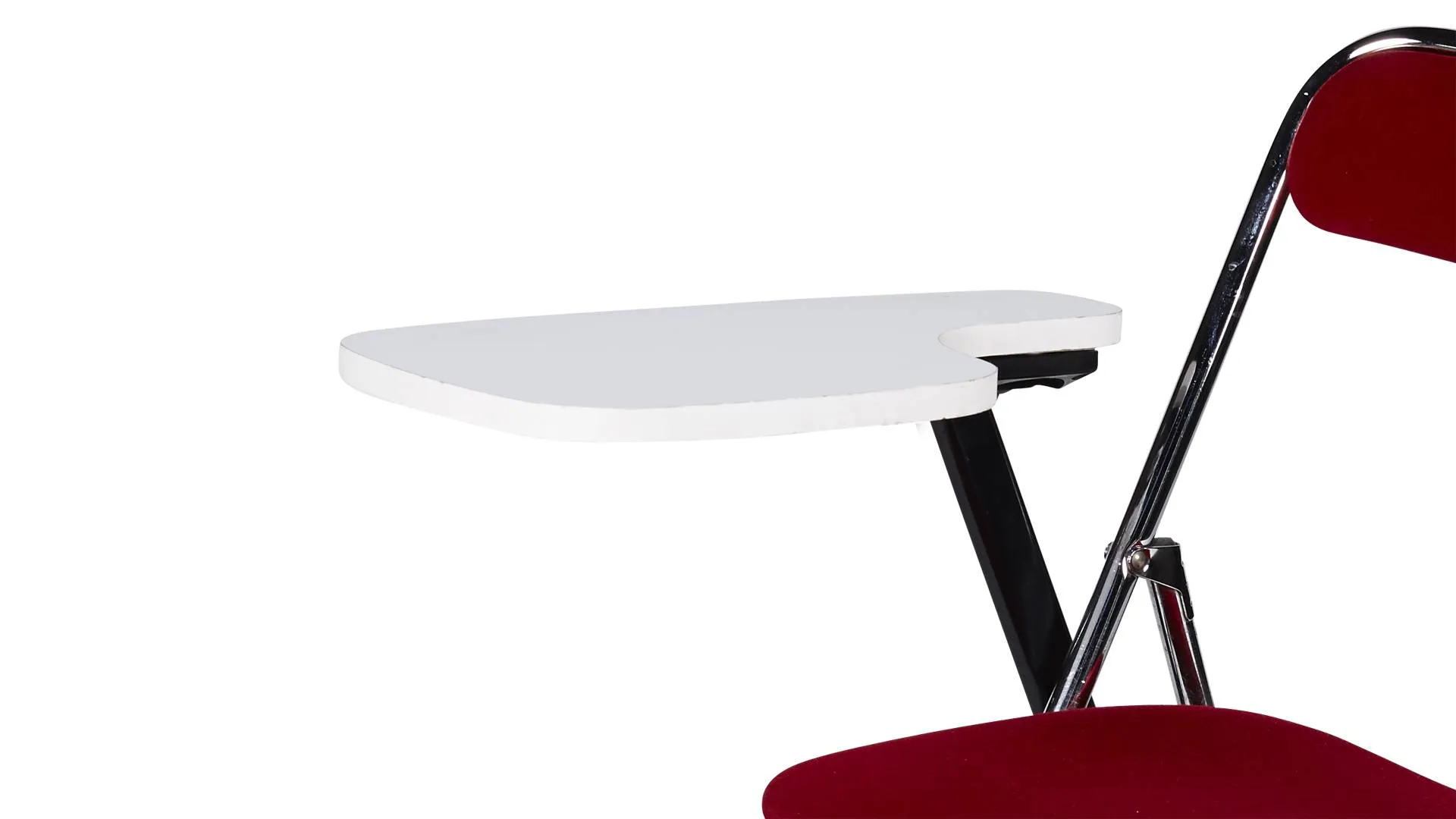Sa mousse située au niveau de l’assise et du dossier, lui assure un très bon confort d’assise. Son empiètement est en chrome. La tablette écritoire est montée sur une rotule. Elle permet donc un basculement frontal et latéral. Vos invités pourront accéder plus facilement au siège. A préciser, ces tablettes écritoires sont uniquement pour droitier.