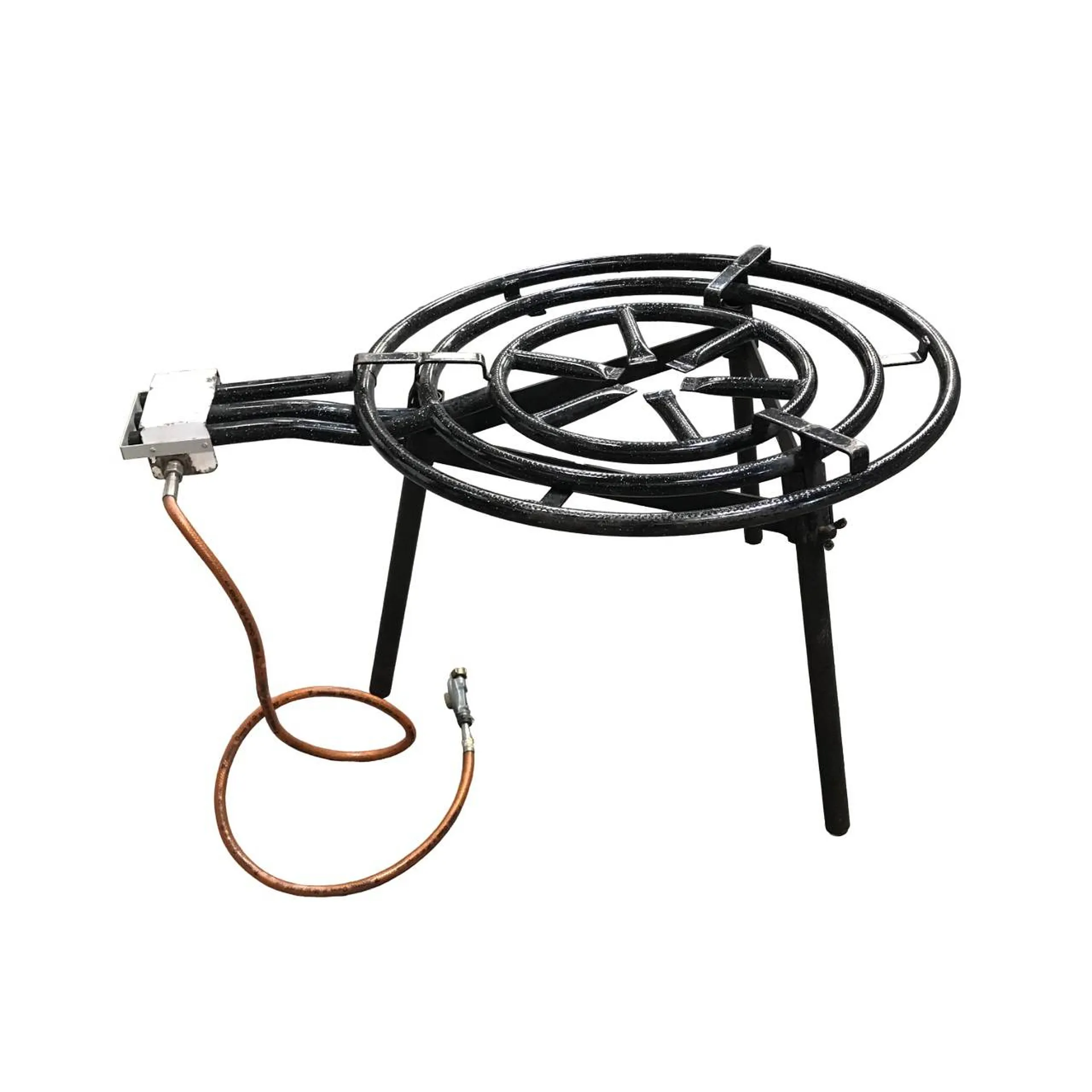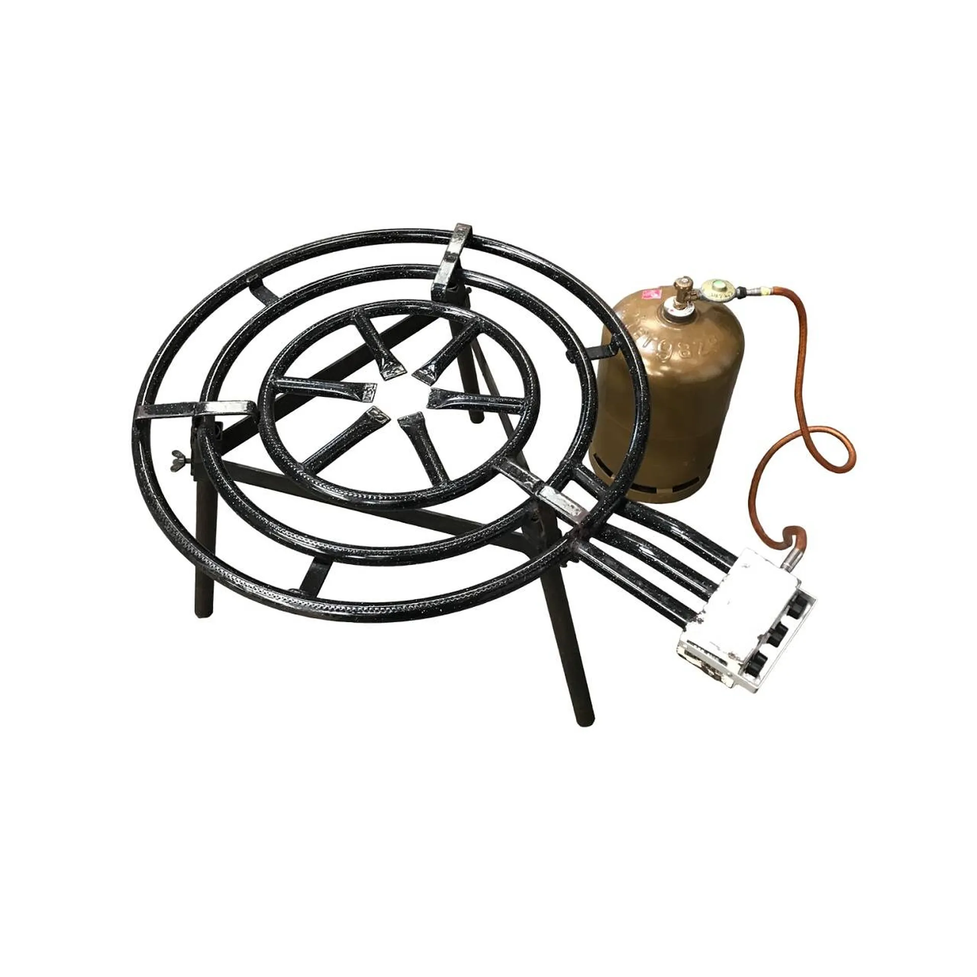 un réchaud de diamètre 90cm équipé de 3 pieds avec 3 rampes de gaz. Les 3 rampes sont réglables grâce à 3 boutons indépendants ce qui permet de les utiliser en même temps ou indépendamment. Le réglage de la flamme est facile pour cuisiner en toute sécurité. Sa hauteur est idéale pour cuisiner. Il assure la stabilité de la poêle pendant la préparation et la cuisson de la paella. Il est équipé d'un détendeur pour une utilisation avec du gaz propane.