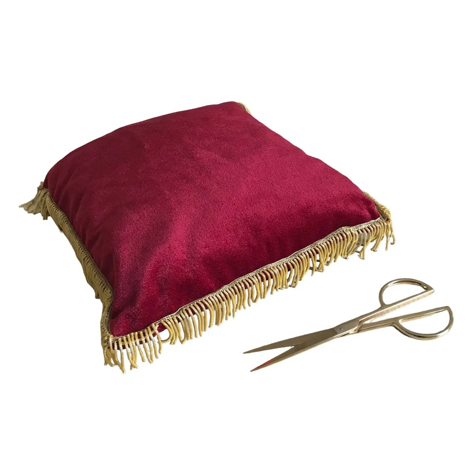 La paire de ciseaux dorés est présentée sur un coussin rouge bordeaux à la personne chargée de couper le ruban.