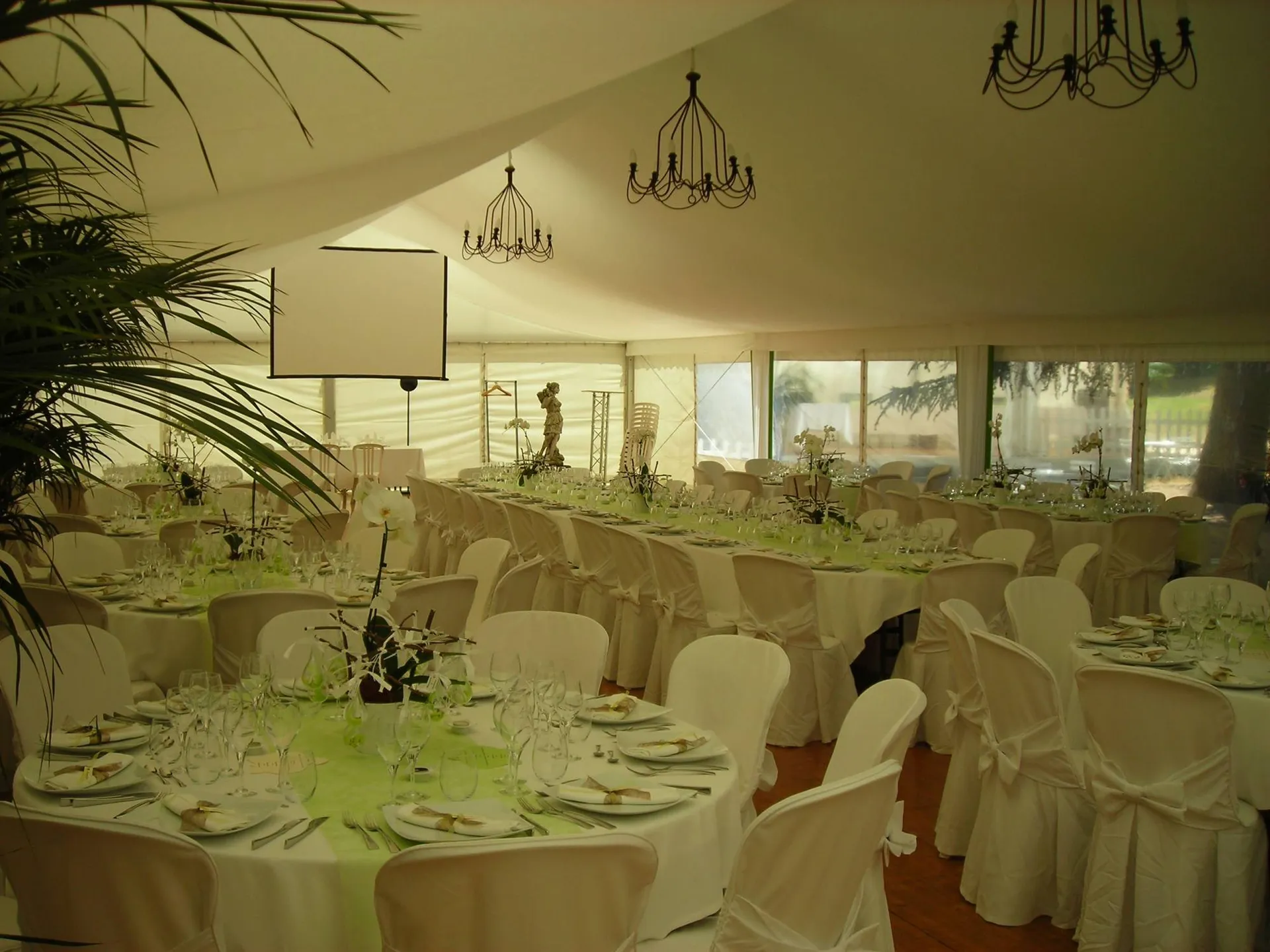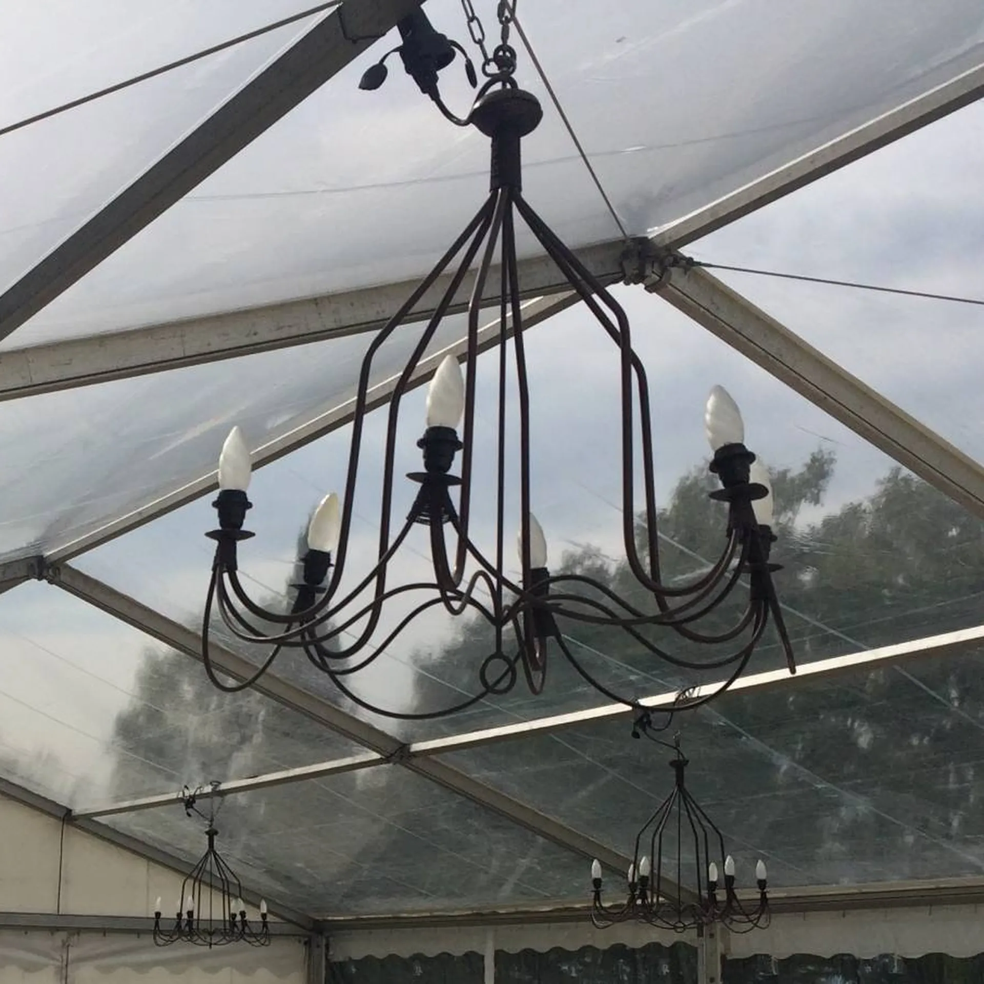 Ce luminaire décoratif suspendu au plafond apportera hauteur et grandeur à votre lieu. Idéal sous une tente, le lustre en fer forgé donnera un côté soigné et travaillé à votre événement. Il remplacera les rampes de 2 et 3 spots de 50W. Nos clients louent principalement cet éclairage pour des mariages ou des réceptions.