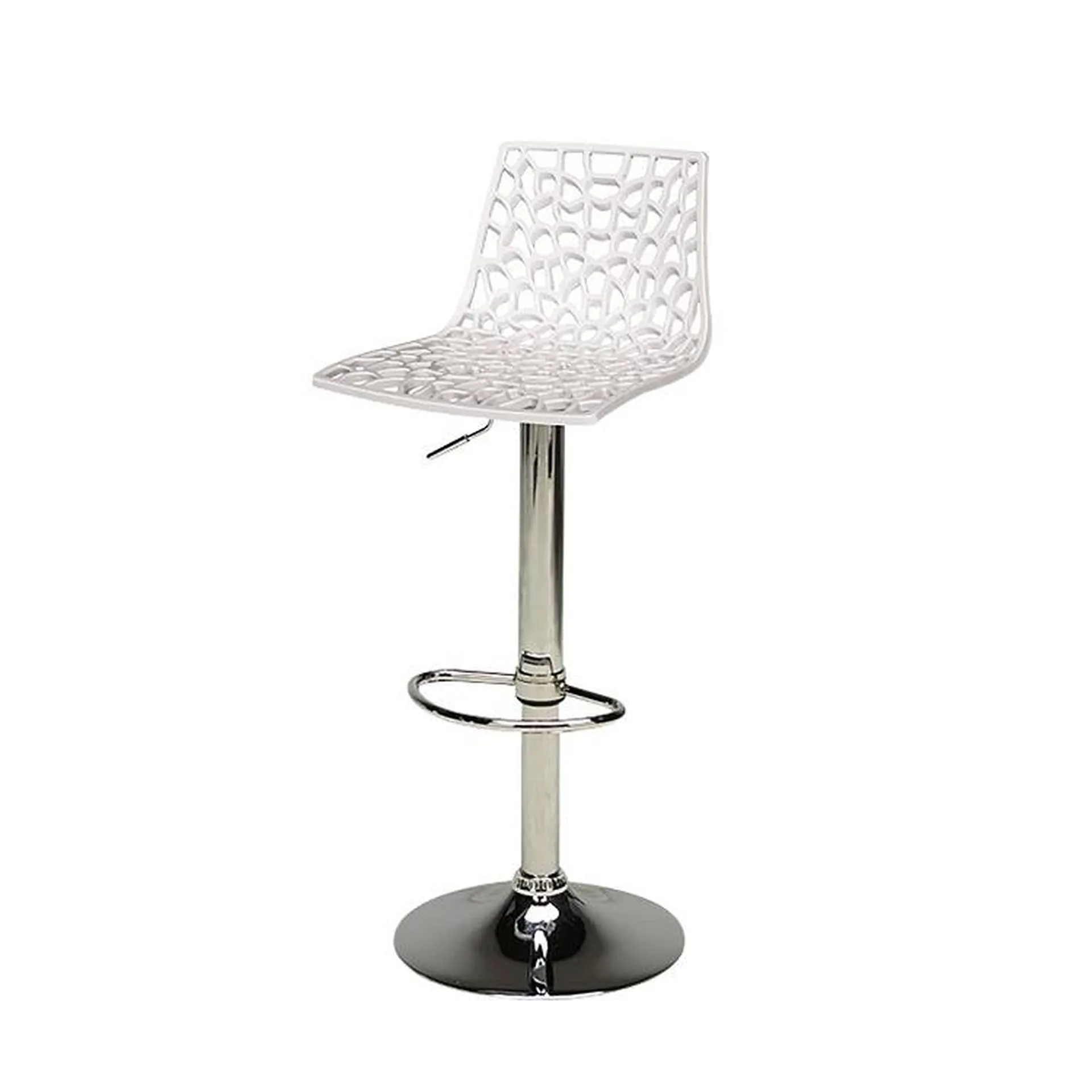 Le tabouret de bar Bruges blanc nid d'abeille est constitué d'un pied en acier chromé et d'une assise en polypropylène blanc brillant ajouré comme une toile d'araignée.